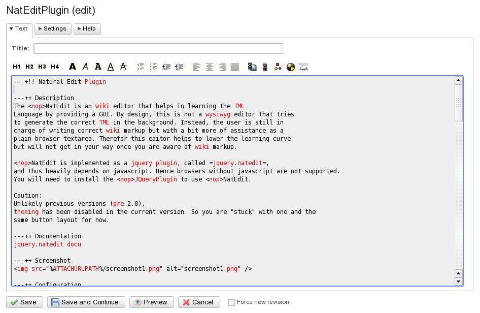 | 07 Jan 2009 | support for TinyMCEPlugin wysiwyg editor; removed non-maintained "word" style; fixes for foswiki/compat; added settings template; distinguishing restore revision from a normal edit; made DBCachePlugin's topic title feature optional; added "Show on screen" settings to easily switch off form, attachment or meta:comments (forthcoming); fixed action=text; removing TopicTitle formfield from the "Form" tab if it is already on the "Text" tab | |||||||||||||||
